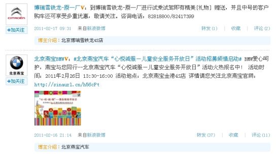 新浪汽车北京站的微博专题《北京车市2月促销一览》,将数十家北京4S店最新的促销信息,推送给了广大的新浪微博网友。本专题以免费的特点、超出预期的营销效果,一经推出就广受商家和网友追捧,创造了很高的点击量和转载率。