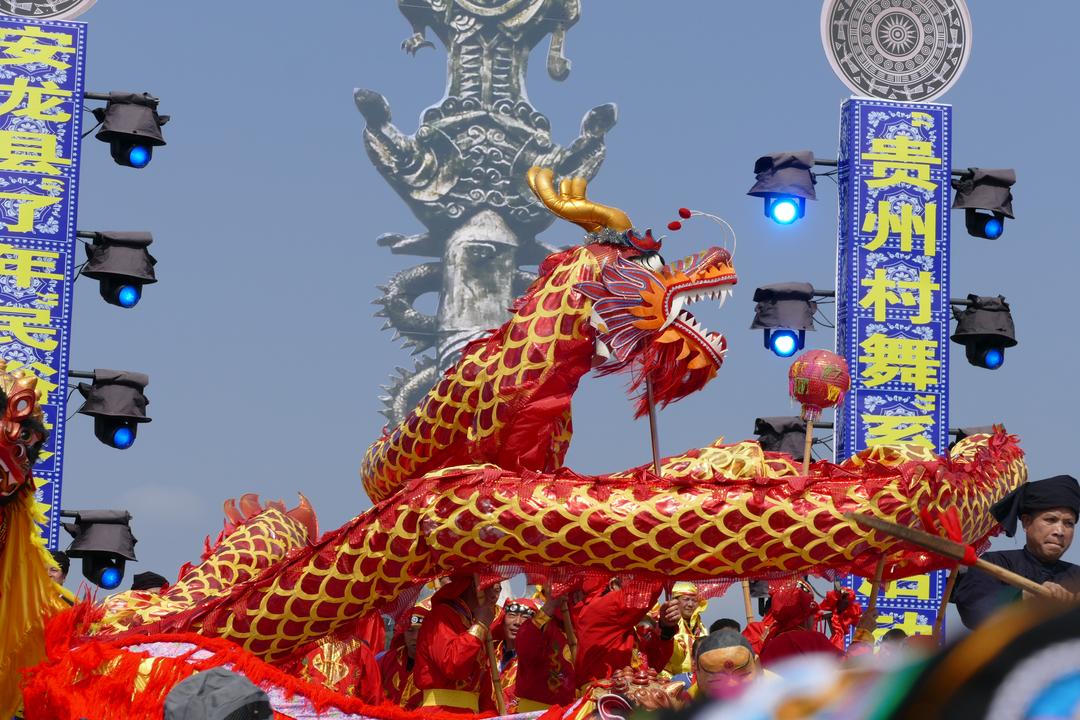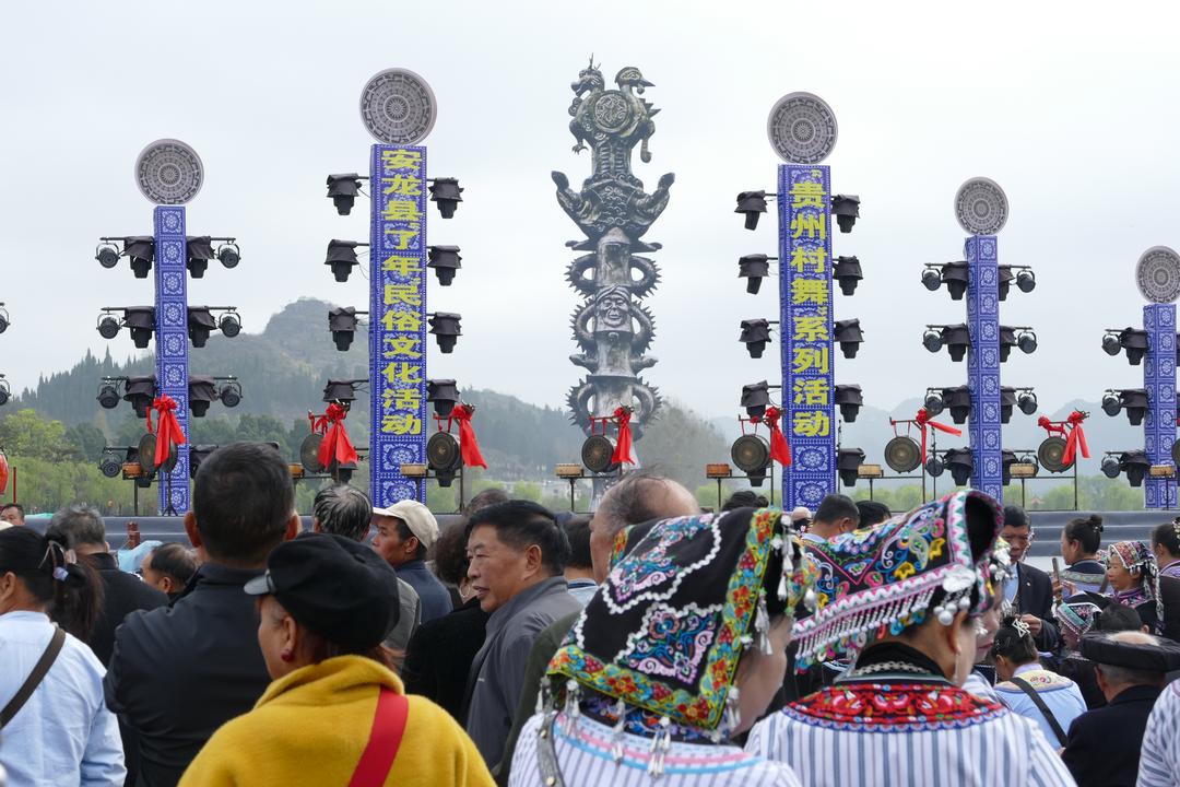 中国龙网贵州消息(融媒体记者 韦元龙 刘昌华 摄影报道)春风恋柳,彩云亲天。3月18日(农历正月30日)贵州省黔西南布依族苗族自治州安龙县“贵州村舞”系列活动暨安龙县“了年”民俗文化活动在风景如画的安龙招堤风景名胜区半水广场隆重举办。