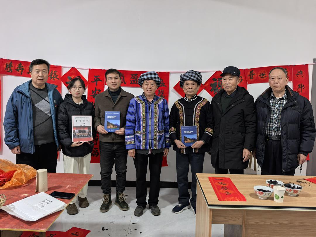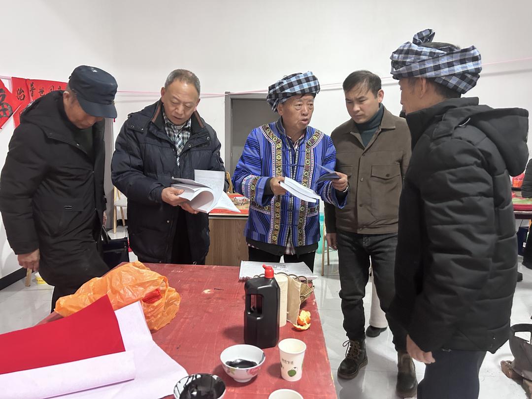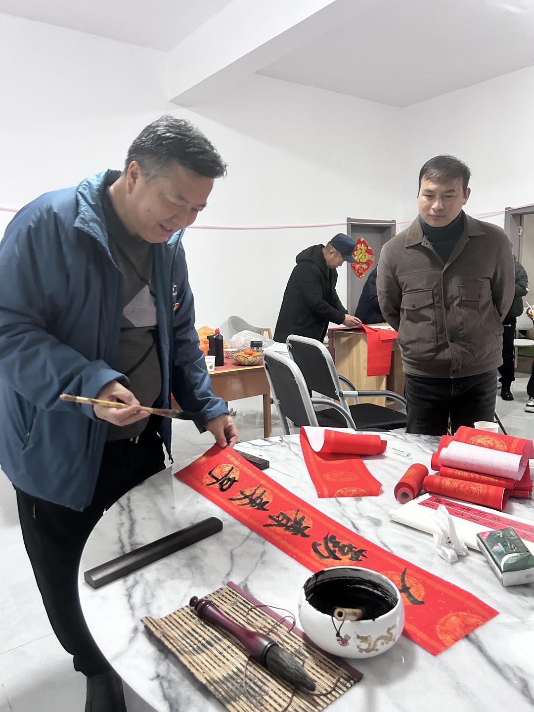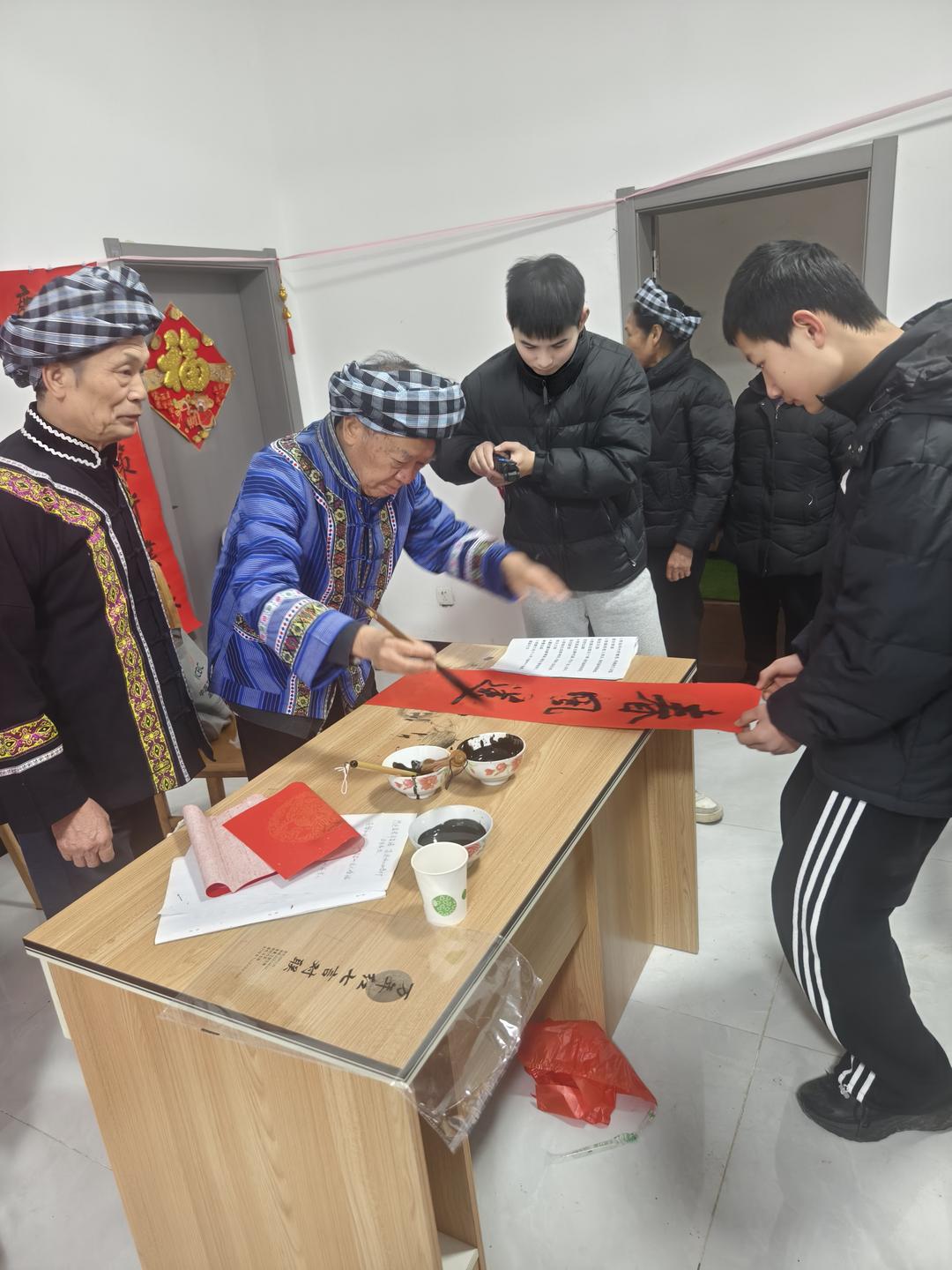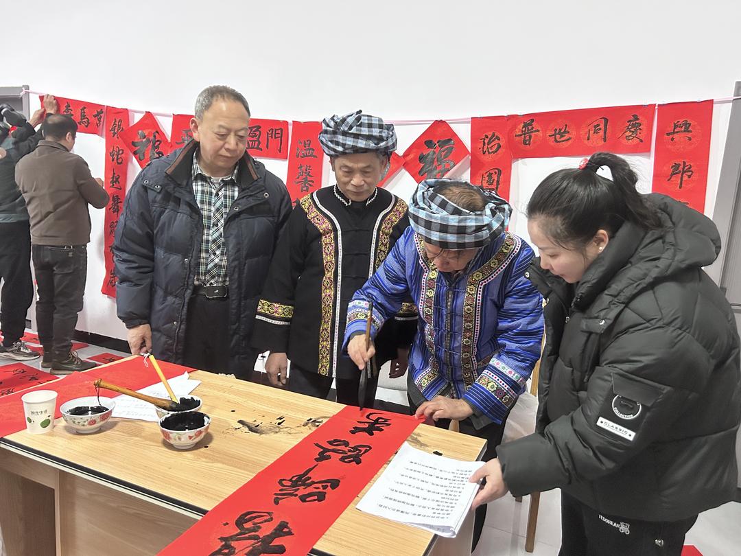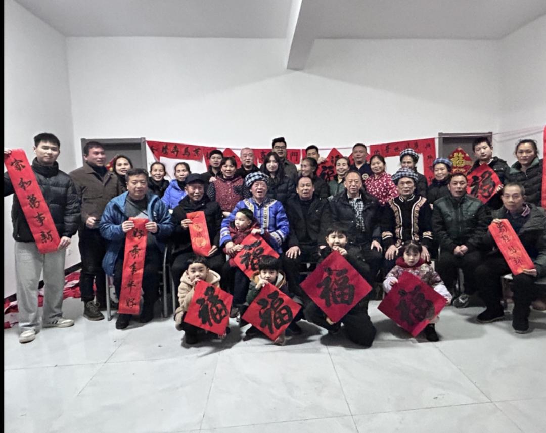 当天下午,在贵州省有关部门退休的罗用能、吳兴荣、吕建明、李玉栋、谌东平等几位老同志,深入贵阳市花溪区金竹镇几十户新市民家中义务书春,送上美好的祝福。据了解,这几十户新居民,是当年从黔西南州望谟县库区搬迁的部分移民,他们到贵阳以后,安居乐业,享受幸福生活。