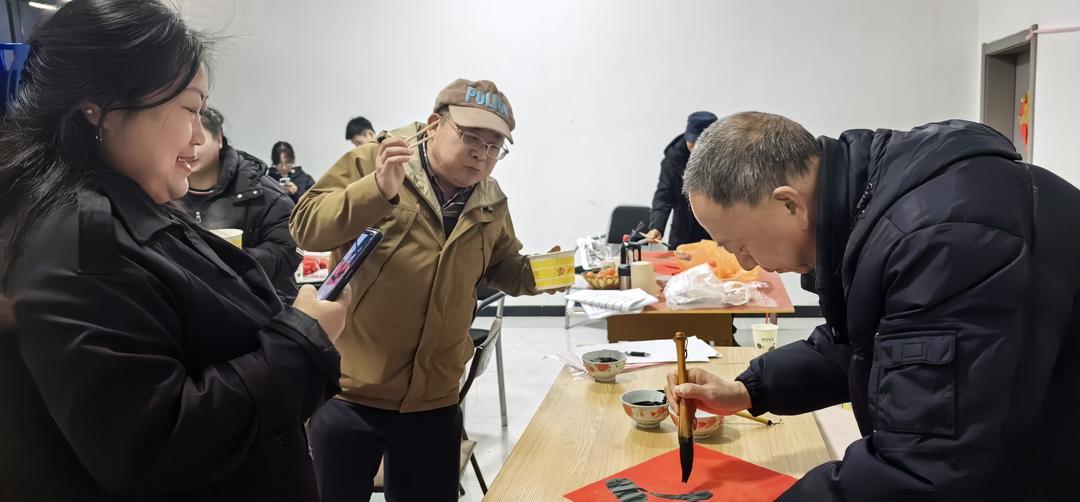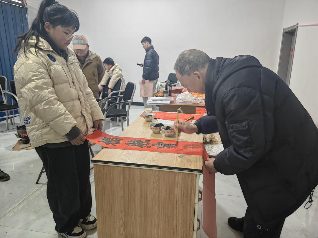 送春联现场,几位银龄老师伏案创作,挥毫泼墨,义务书写了春联20多幅赠送乡亲。并向在读大学生、中学生、小学生们逐一签赠了丙午年之春书笺式贺年卡,激励青少年一代好好学习,自強不息。